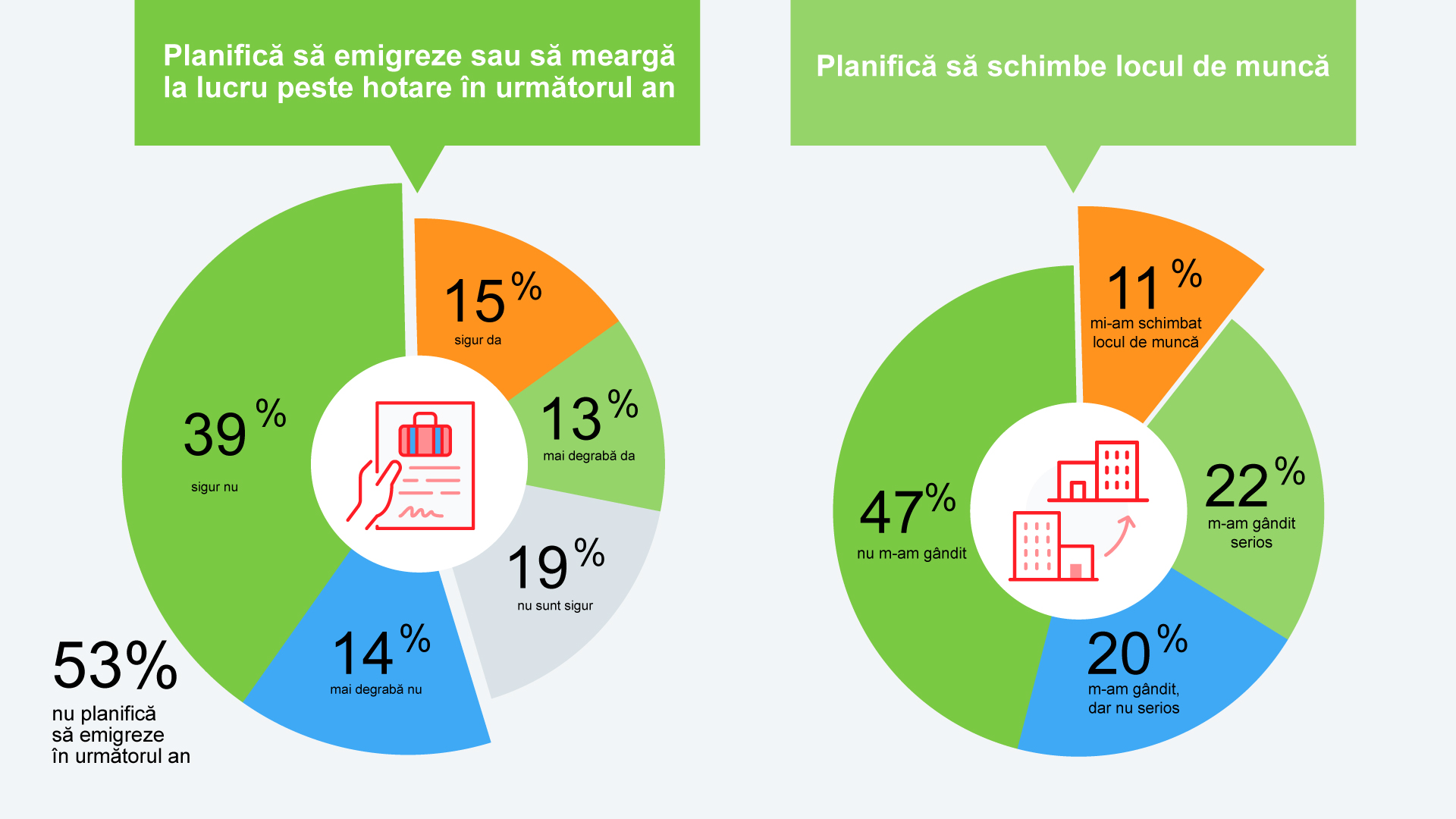 Majoritatea respondenților au declarat că nu planifică să emigreze sau să meargă la lucru peste hotare în următorul an (53%), în timp ce 15% sunt siguri că vor alege să emigreze în următoarele 12 luni. În ultimul an, fiecare al treilea respondent angajat și-a schimbat locul de muncă sau s-a gândit serios la asta.