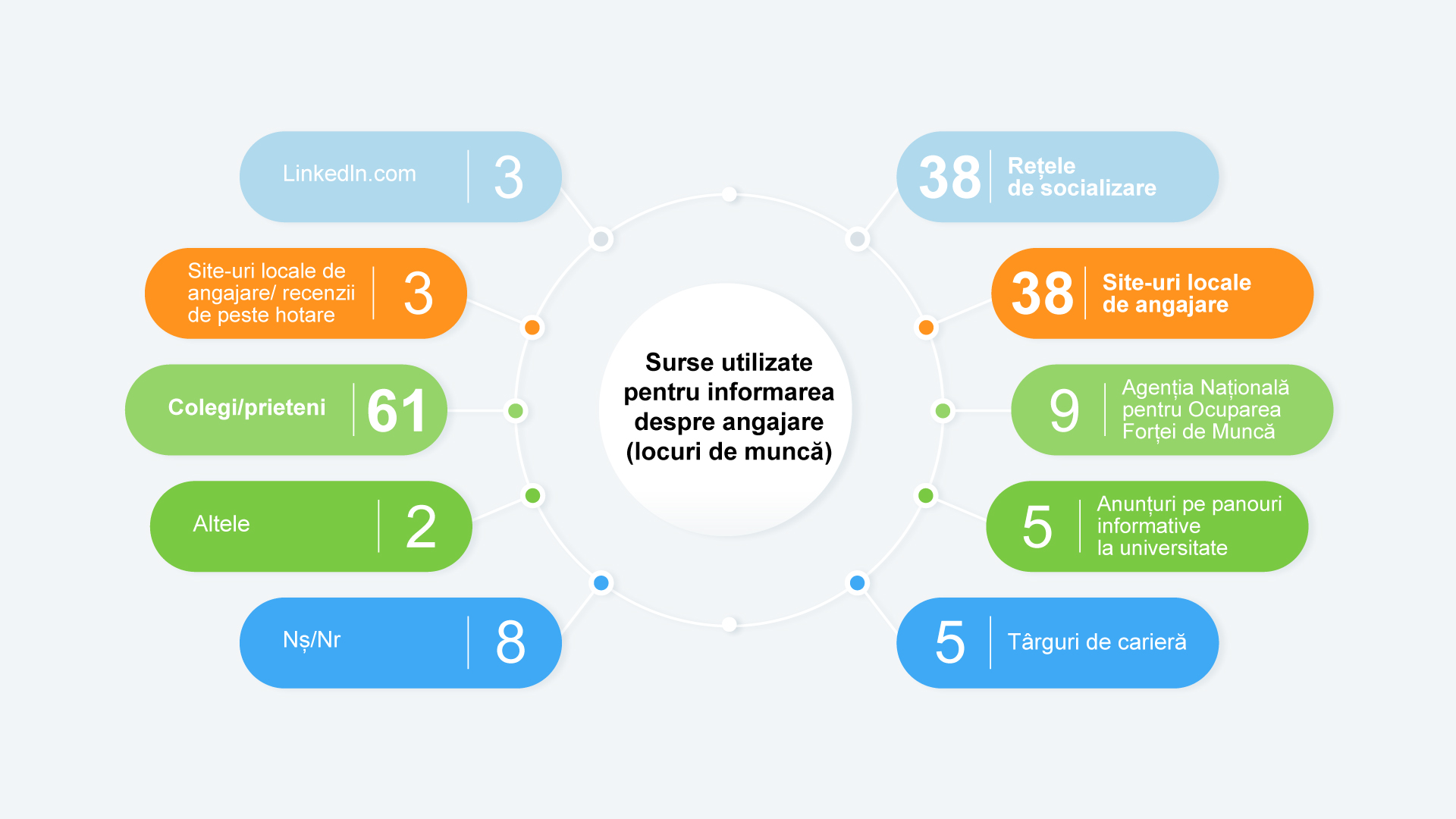 Conform rezultatelor sondajului, doua treimi din respondenți întreabă colegii și prietenii pentru a afla informații despre angajări. Totodată, fiecare al treilea intervievat a menționat că a căutat oferte de muncă pe site-urile locale de angajare sau pe rețelele sociale.