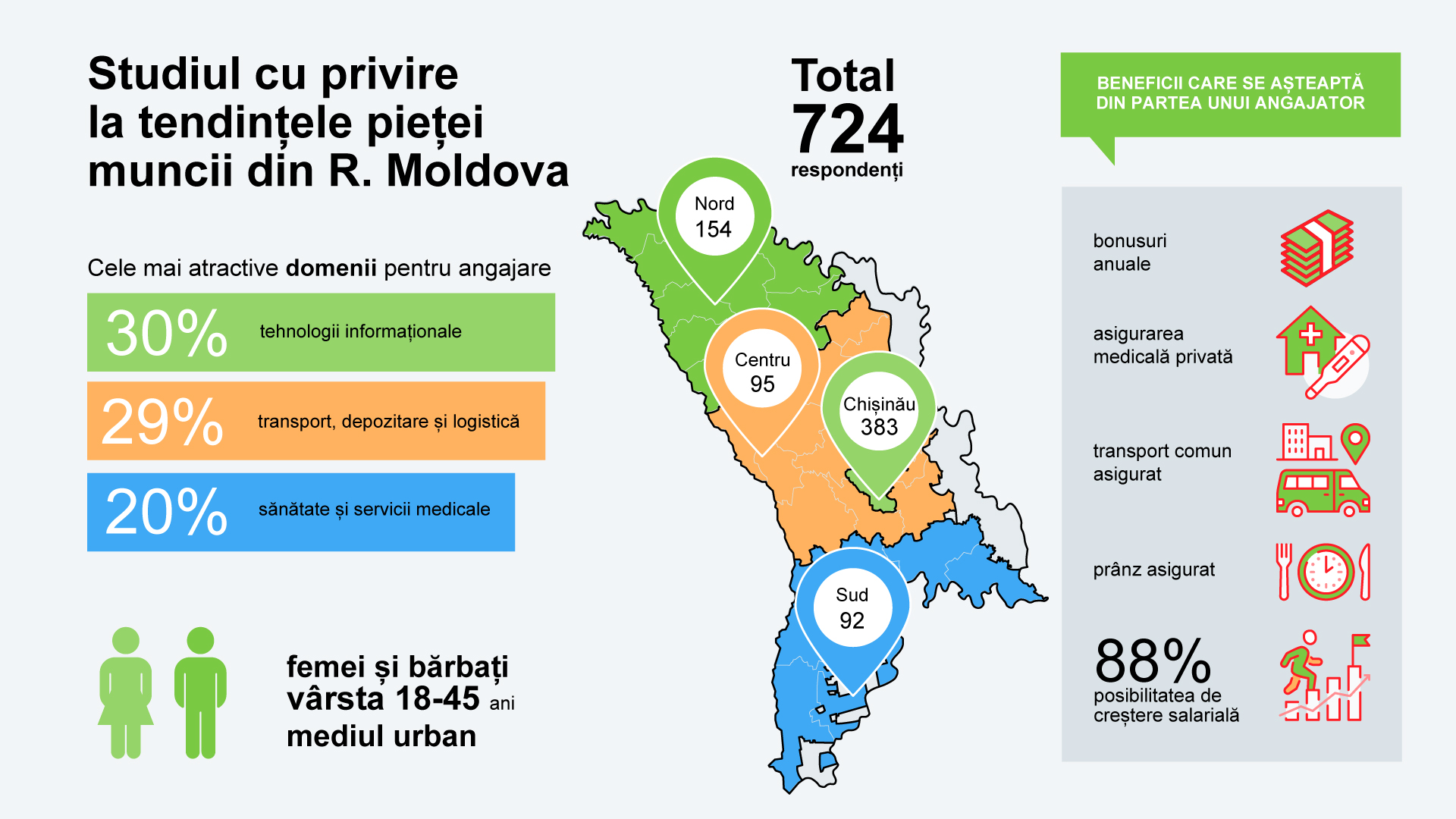 Scopul sondajului a fost să studieze tendințele pieței muncii din Republica Moldova. Rezultatele cuprind opiniile a 724 respondenți, femei și bărbați, cu vârste cuprinse între 18-45 de ani din mediul urban din toată țara.