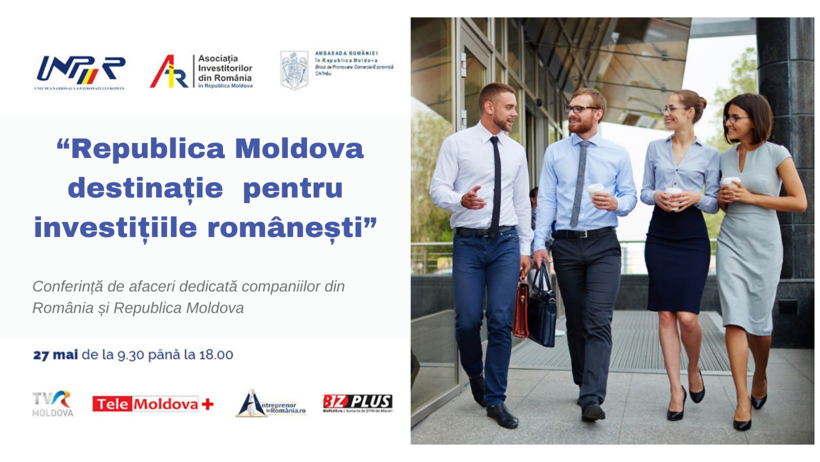 Asociația Investitorilor din România în Republica Moldova (AIR), Uniunea Națională a Patronatului Român (UNPR) și Biroul de Promovare Comercial-Economică Chișinău (BPCEC) din cadrul Ambasadei României în Republica Moldova invită agenții economici să participe la CONFERINȚA DE AFACERI ”Republica Moldova – destinație pentru investițiile românești” ce va avea loc în format on-line, în ziua 27 mai, cu începere la ora 09.30.