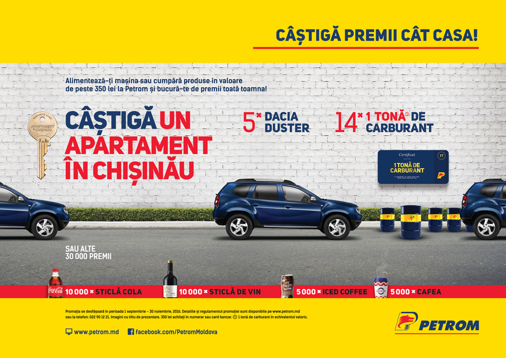 În perioada 01 septembrie – 30 noiembrie 2016, în stațiile Petrom Moldova, a fost lansată o mega Campanie Promoțională fără precedent, în cadrul căreia peste 30 000 de premii își așteaptă câștigătorii.