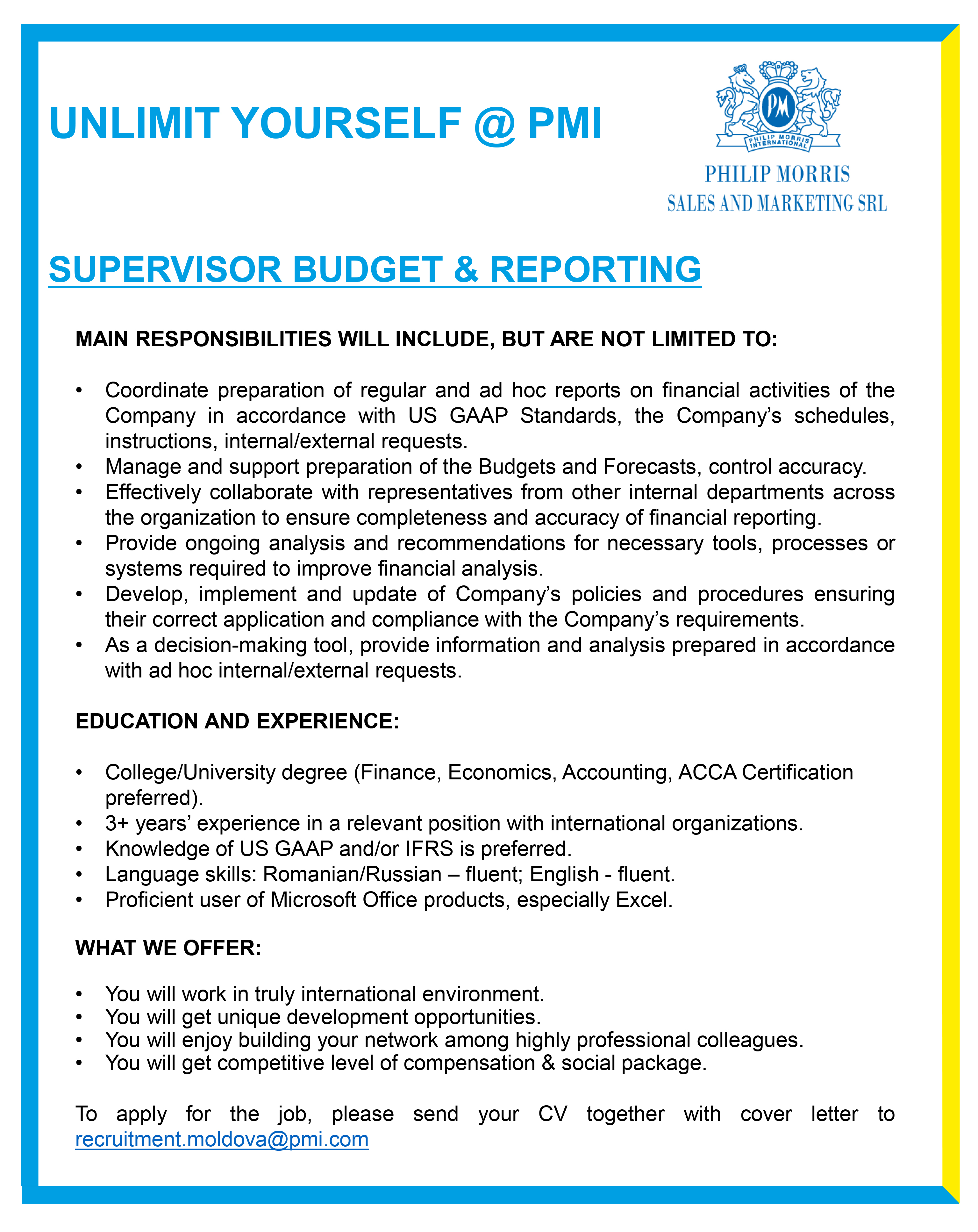 Philip Morris Sales & Marketing was established in the Republic of Moldova in 1996. It is one of the largest tobacco companies from the Republic of Moldova, striving to be a responsible employer, a major contributor to the state budget and a promoter of the sustainability principles. Philip Morris Sales & Marketing is the affiliate of Philip Morris International, a leading international tobacco company, actively delivering a smoke-free future and evolving its portfolio for the long term to include products outside of the tobacco and nicotine sector. The company’s current product portfolio primarily consists of cigarettes and smoke-free products. Since 2008, PMI has invested over $14 billion to develop, scientifically substantiate and commercialize innovative smoke-free products for adults who would otherwise continue to smoke, with the goal of completely ending the sale of cigarettes. This includes the building of world-class scientific assessment capabilities, notably in the areas of pre-clinical systems toxicology, clinical and behavioral research, as well as post-market studies.