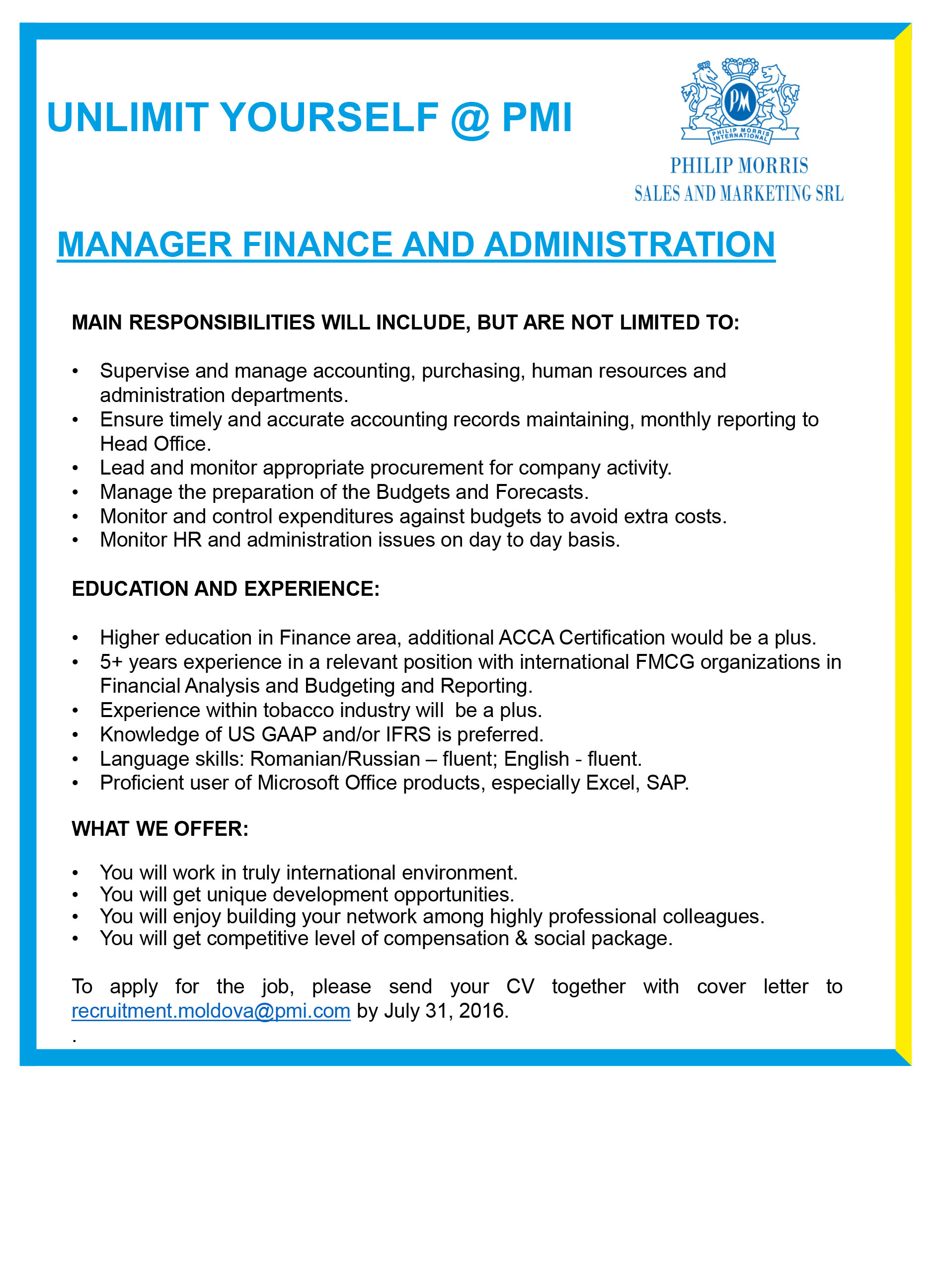 Philip Morris Sales & Marketing was established in the Republic of Moldova in 1996. It is one of the largest tobacco companies from the Republic of Moldova, striving to be a responsible employer, a major contributor to the state budget and a promoter of the sustainability principles. Philip Morris Sales & Marketing is the affiliate of Philip Morris International, a leading international tobacco company, actively delivering a smoke-free future and evolving its portfolio for the long term to include products outside of the tobacco and nicotine sector. The company’s current product portfolio primarily consists of cigarettes and smoke-free products. Since 2008, PMI has invested over $14 billion to develop, scientifically substantiate and commercialize innovative smoke-free products for adults who would otherwise continue to smoke, with the goal of completely ending the sale of cigarettes. This includes the building of world-class scientific assessment capabilities, notably in the areas of pre-clinical systems toxicology, clinical and behavioral research, as well as post-market studies.