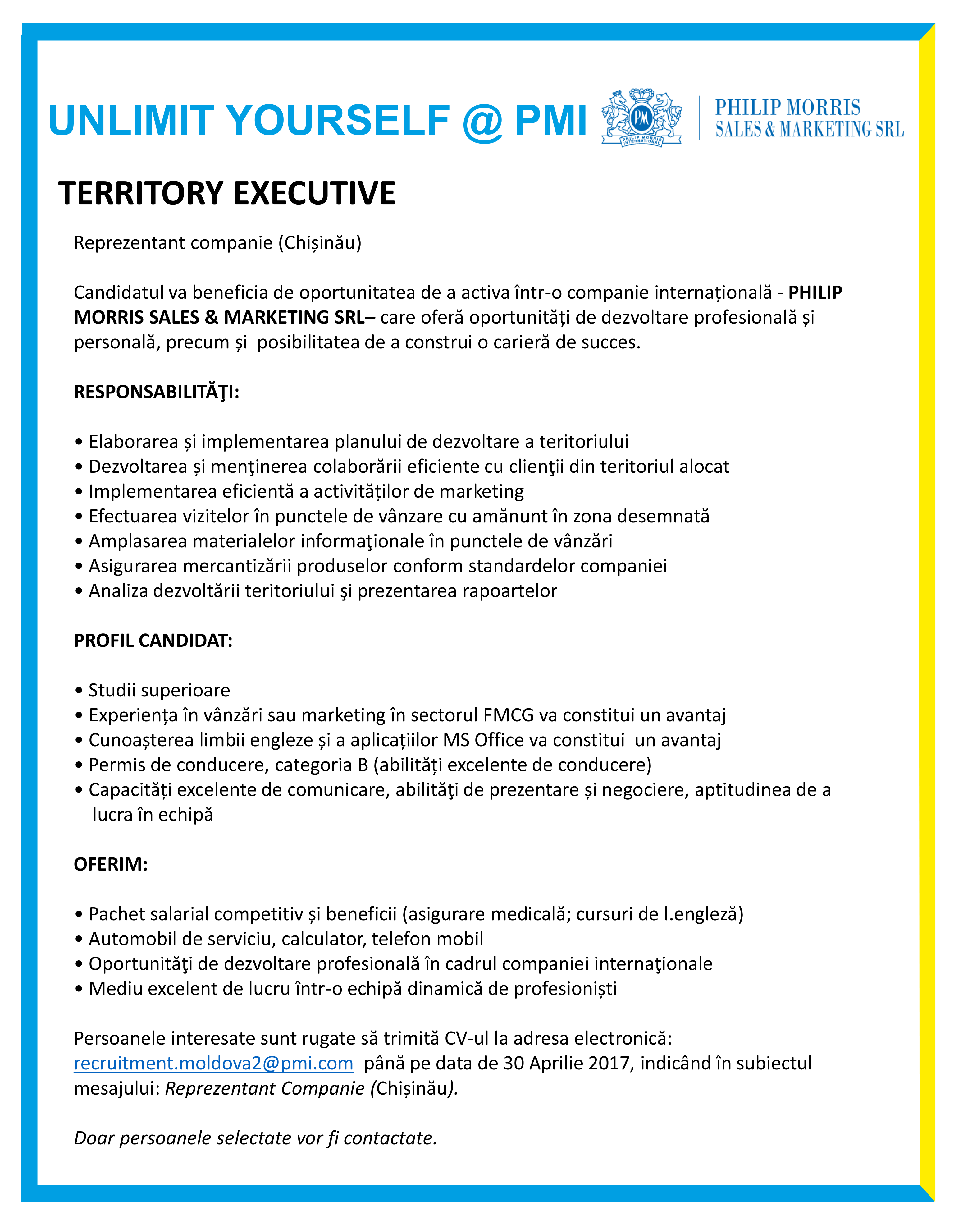 Philip Morris Sales & Marketing was established in the Republic of Moldova in 1996. It is one of the largest tobacco companies from the Republic of Moldova, striving to be a responsible employer, a major contributor to the state budget and a promoter of the sustainability principles. Philip Morris Sales & Marketing is the affiliate of Philip Morris International, a leading international tobacco company, actively delivering a smoke-free future and evolving its portfolio for the long term to include products outside of the tobacco and nicotine sector. The company’s current product portfolio primarily consists of cigarettes and smoke-free products. Since 2008, PMI has invested over $14 billion to develop, scientifically substantiate and commercialize innovative smoke-free products for adults who would otherwise continue to smoke, with the goal of completely ending the sale of cigarettes. This includes the building of world-class scientific assessment capabilities, notably in the areas of pre-clinical systems toxicology, clinical and behavioral research, as well as post-market studies.