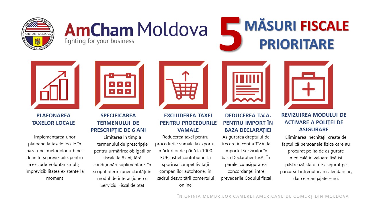 Urmare a anunțului publicat despre Ministerul Finanțelor despre iniţierea elaborării obiectivelor de politici bugetare și fiscale pe anul 2021, precum și perfecționarea administrării fiscale și vamale, Camera Americană de Comerț din Moldova a prezentat în termenii fixați setul de propuneri formulat și definitivat de membrii comunității AmCham Moldova.