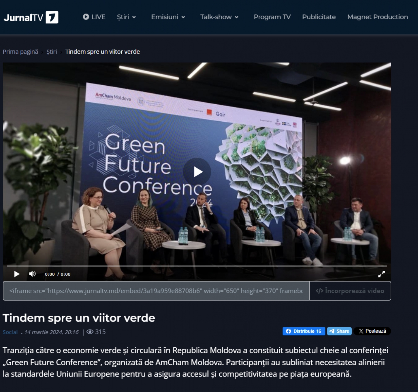 Tranziția către o economie verde și circulară în Republica Moldova a constituit subiectul cheie al conferinței „Green Future Conference”, organizată de AmCham Moldova. Participanții au subliniat necesitatea alinierii la standardele Uniunii Europene pentru a asigura accesul și competitivitatea pe piața europeană.