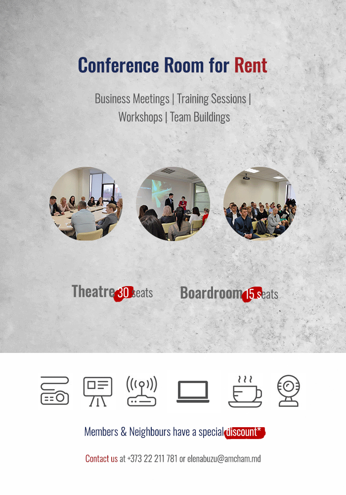 Starting with January, AmCham has a new conference room, in a walking distance from the city center, which is available to rent at a special price.